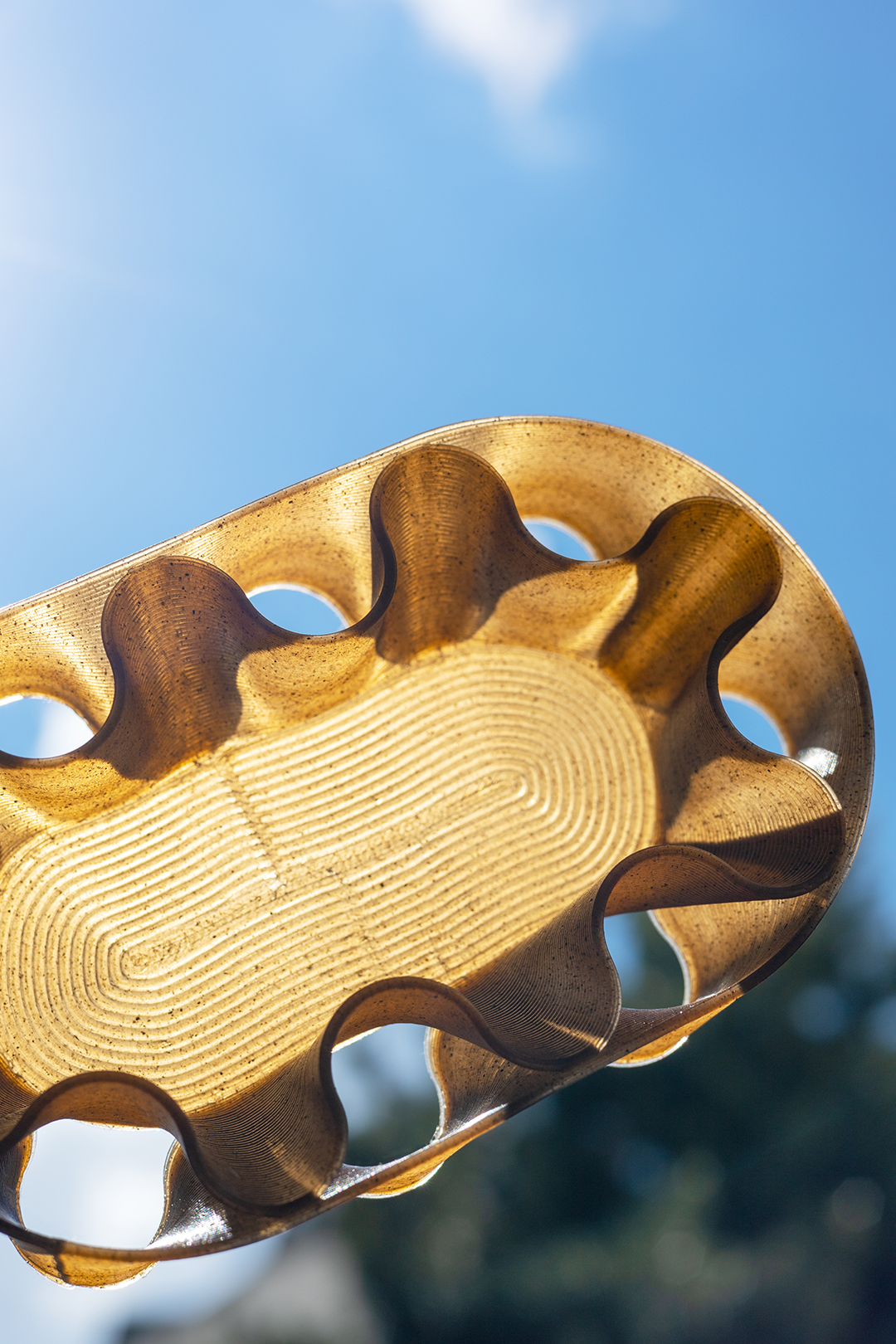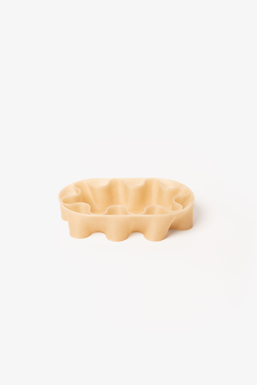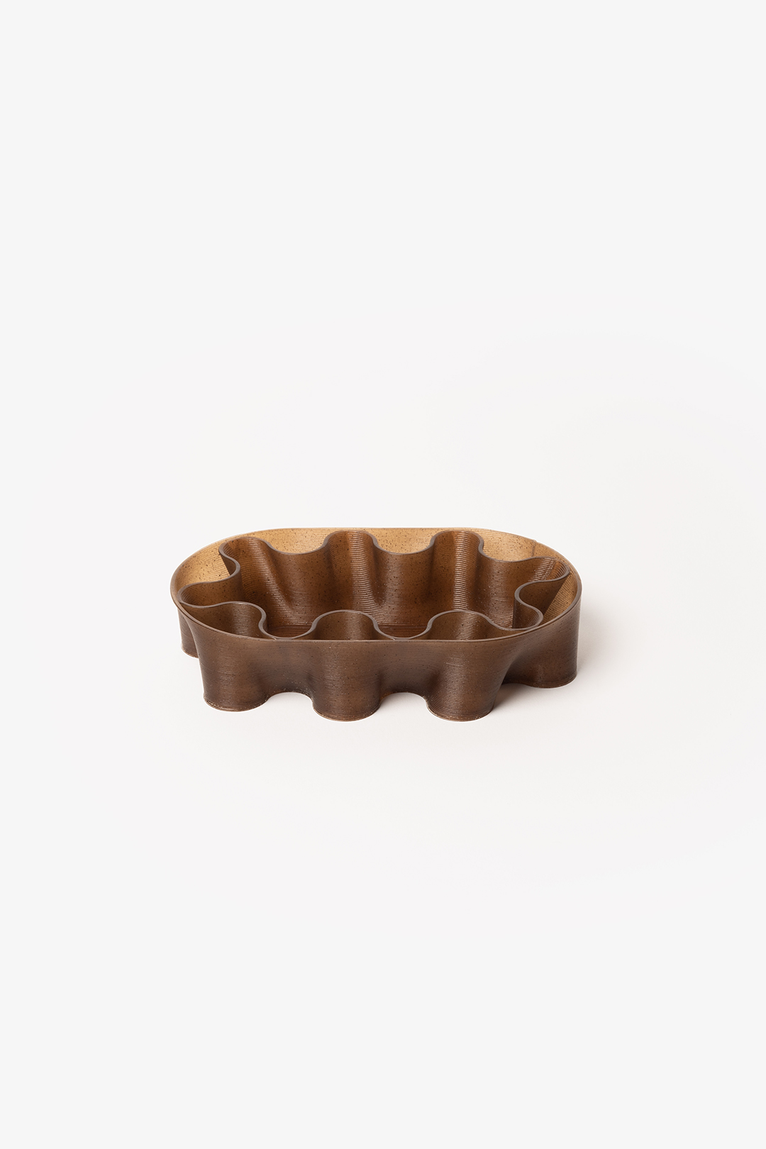 3D-printed tray of bioplastic mixed with waste from food industry.