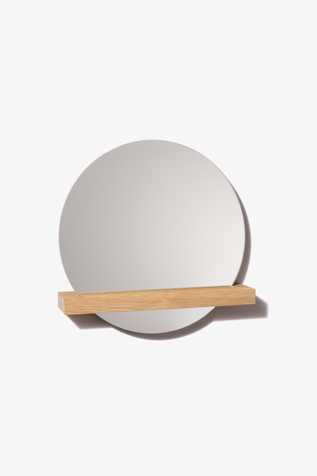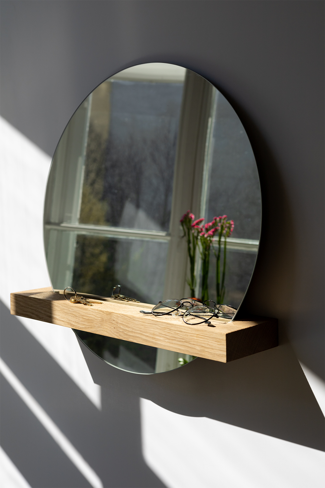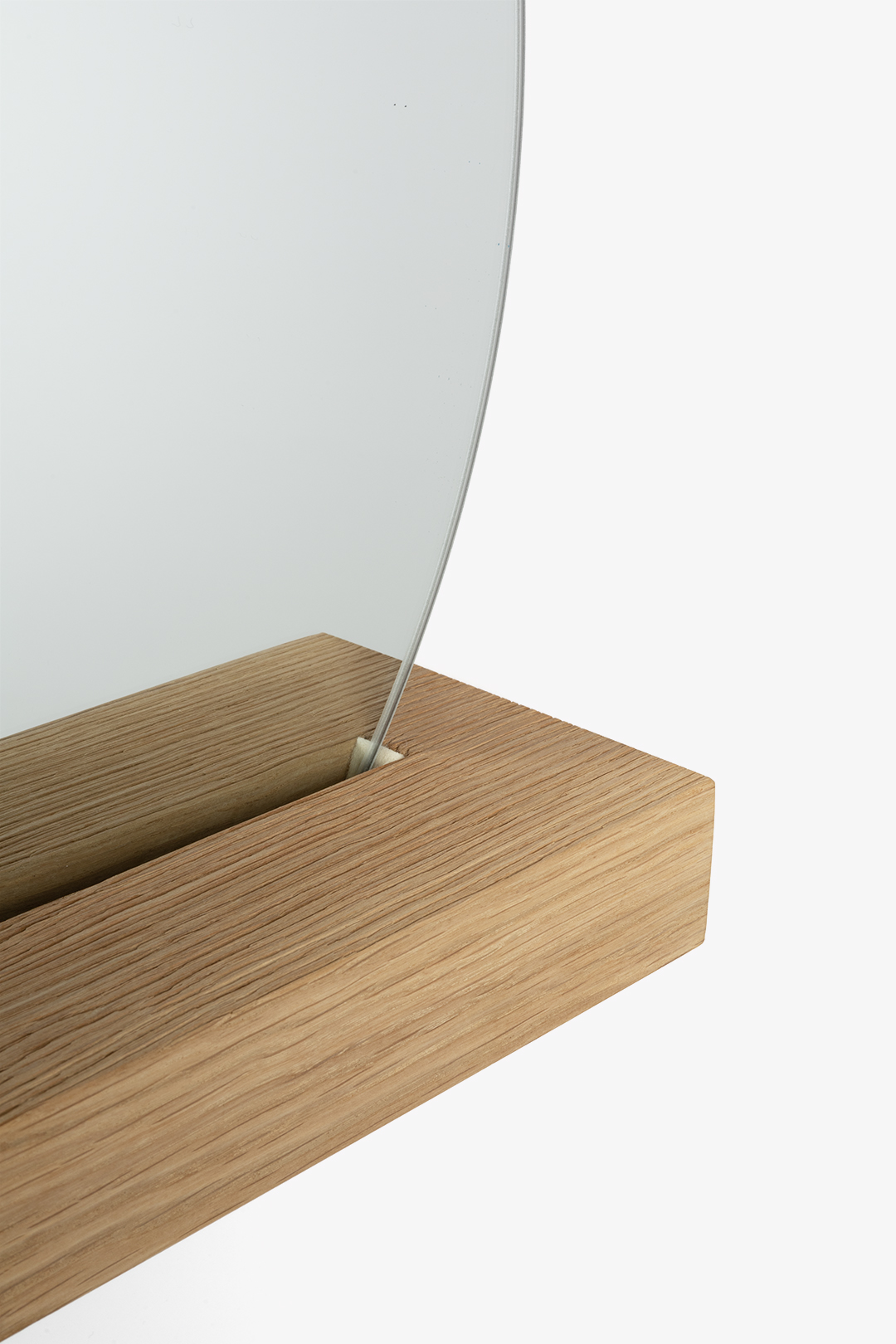 The GLIMPSE wall mirror captivates with its minimalist design. The round mirror glass is simply inserted into the frame board made of solid oak wood, so that the angle of the mirror image can be varied by simply tapping on it.