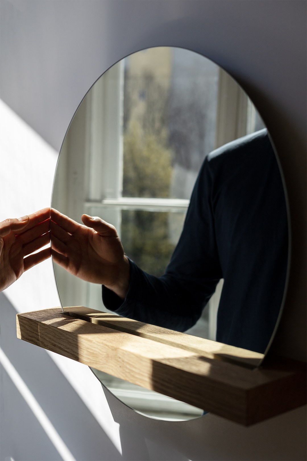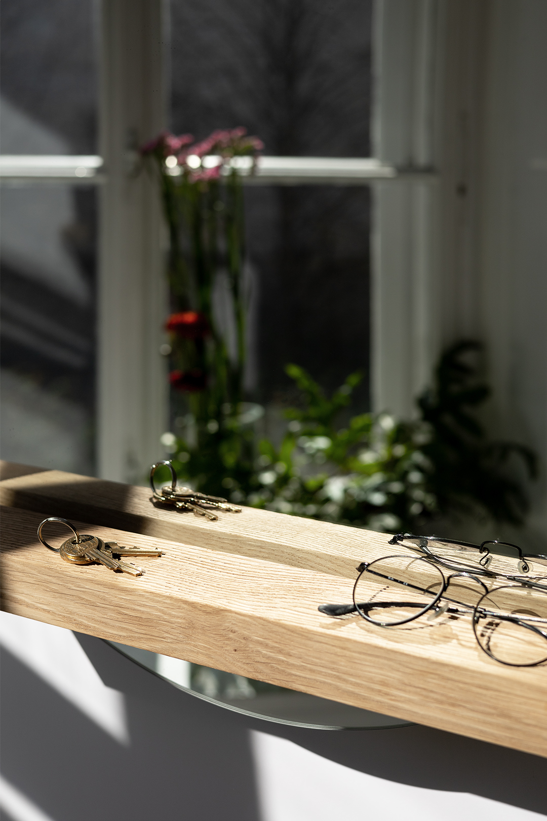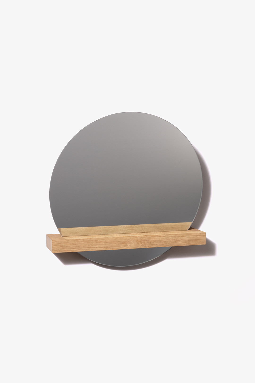 The GLIMPSE wall mirror captivates with its minimalist design. The round mirror glass is simply inserted into the frame board made of solid oak wood, so that the angle of the mirror image can be varied by simply tapping on it.