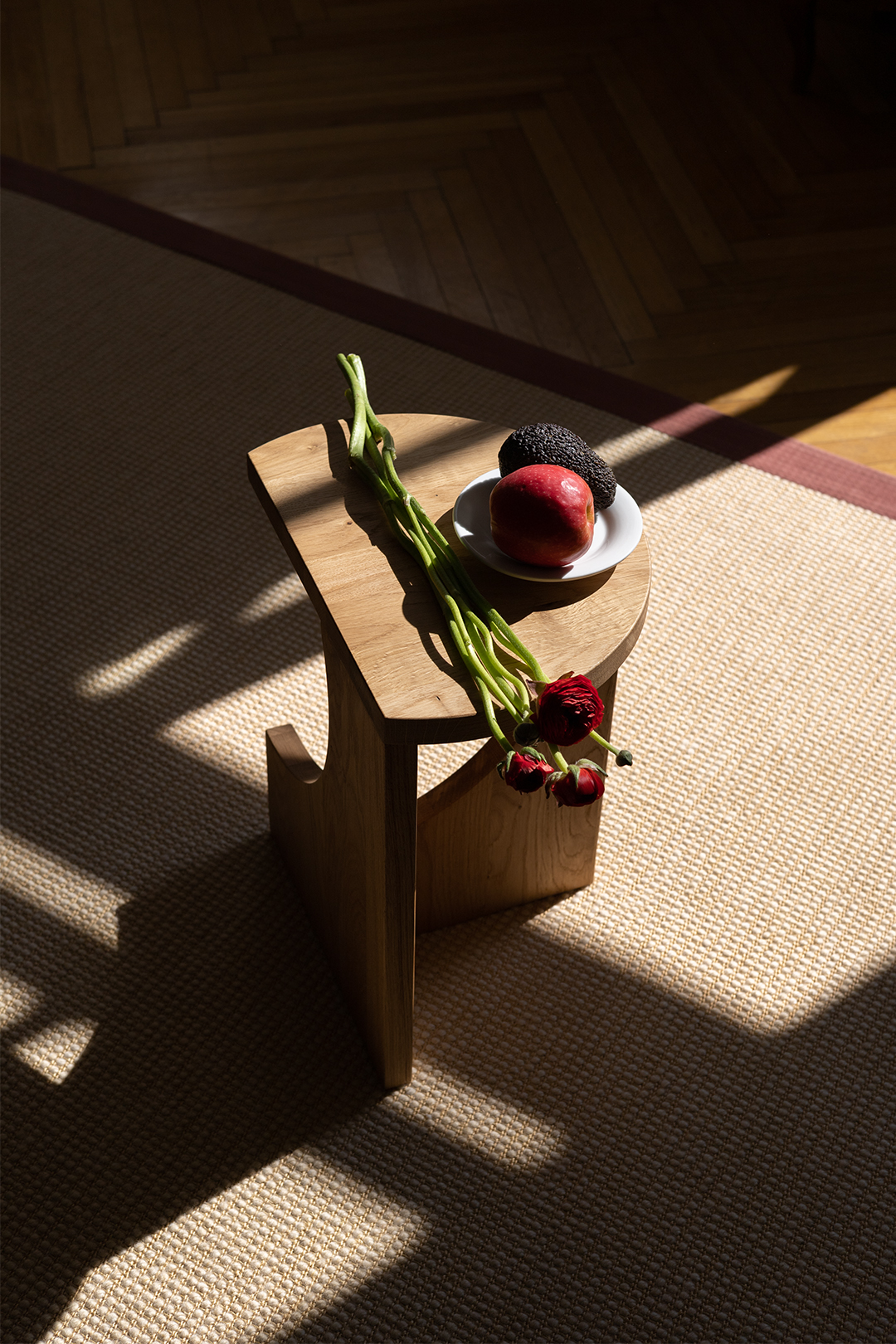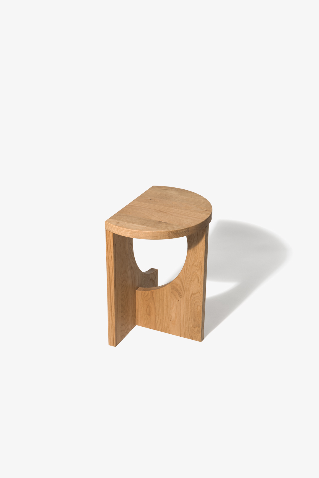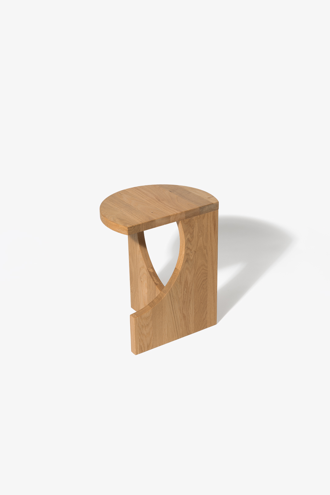 The OPPONENT stool is made of solid oak wood. Due to the recurring shapes, there is no waste leftover during manufacturing. Every piece of the wood is utilized.