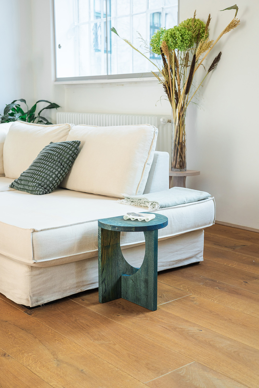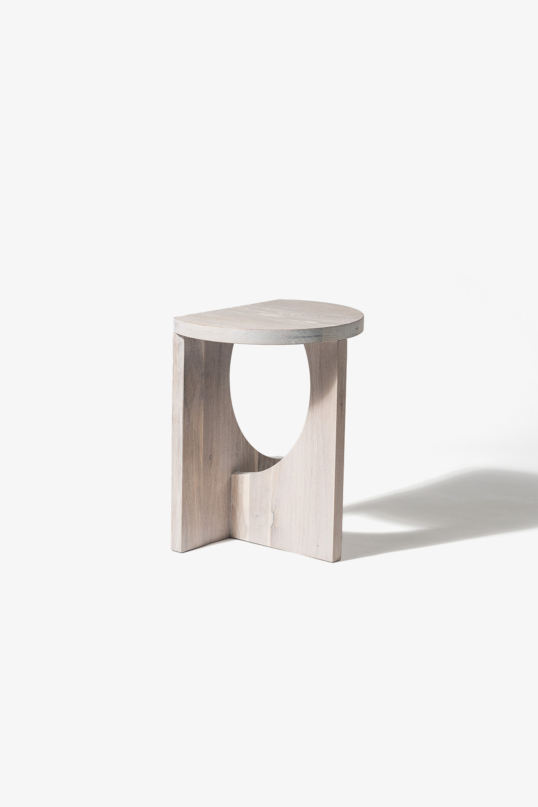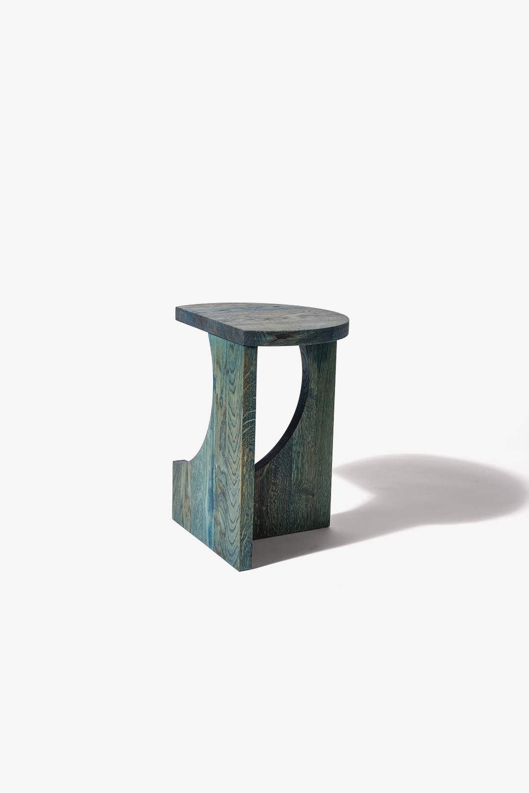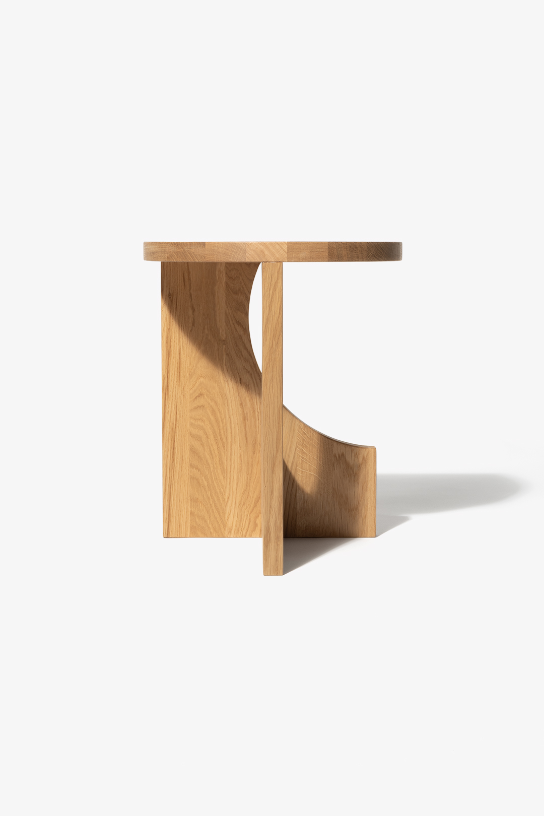 The OPPONENT stool is made of solid oak wood. Due to the recurring shapes, there is no waste leftover during manufacturing. Every piece of the wood is utilized.