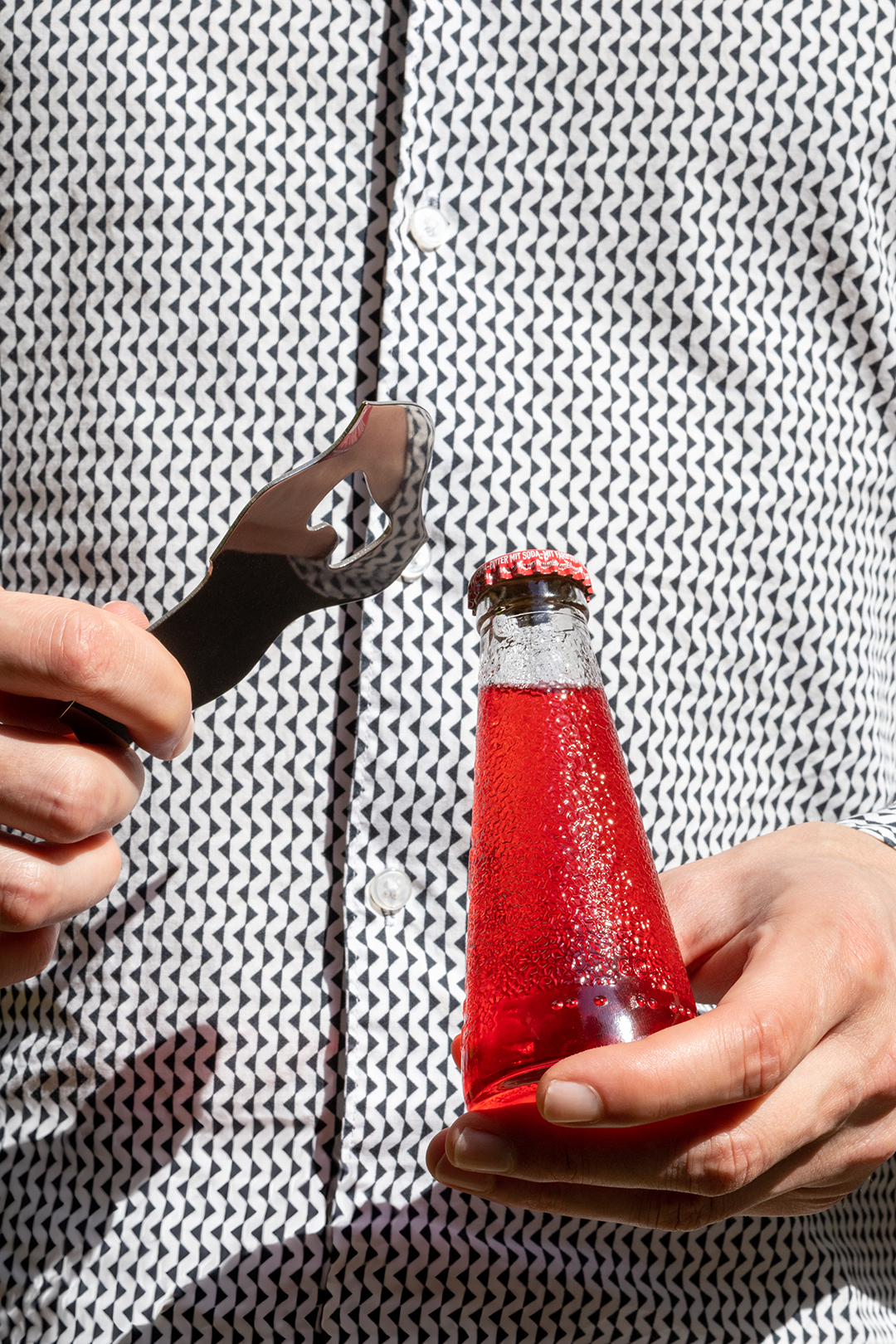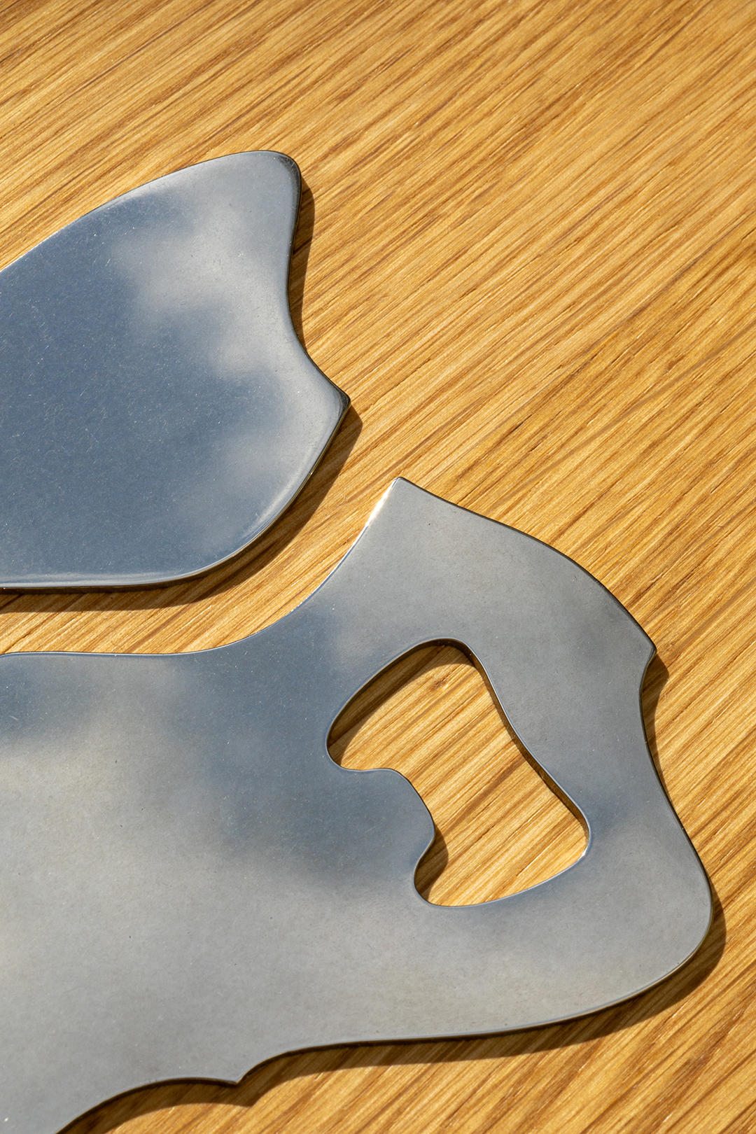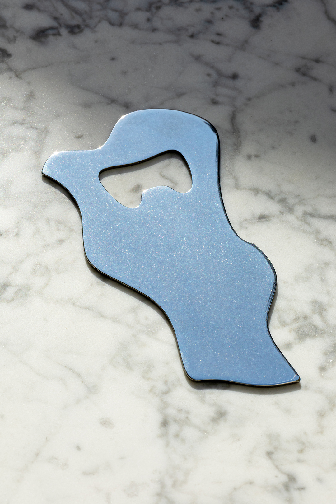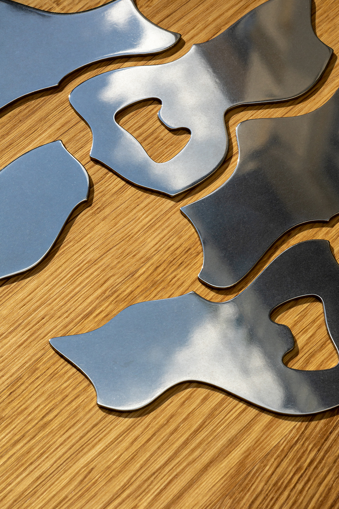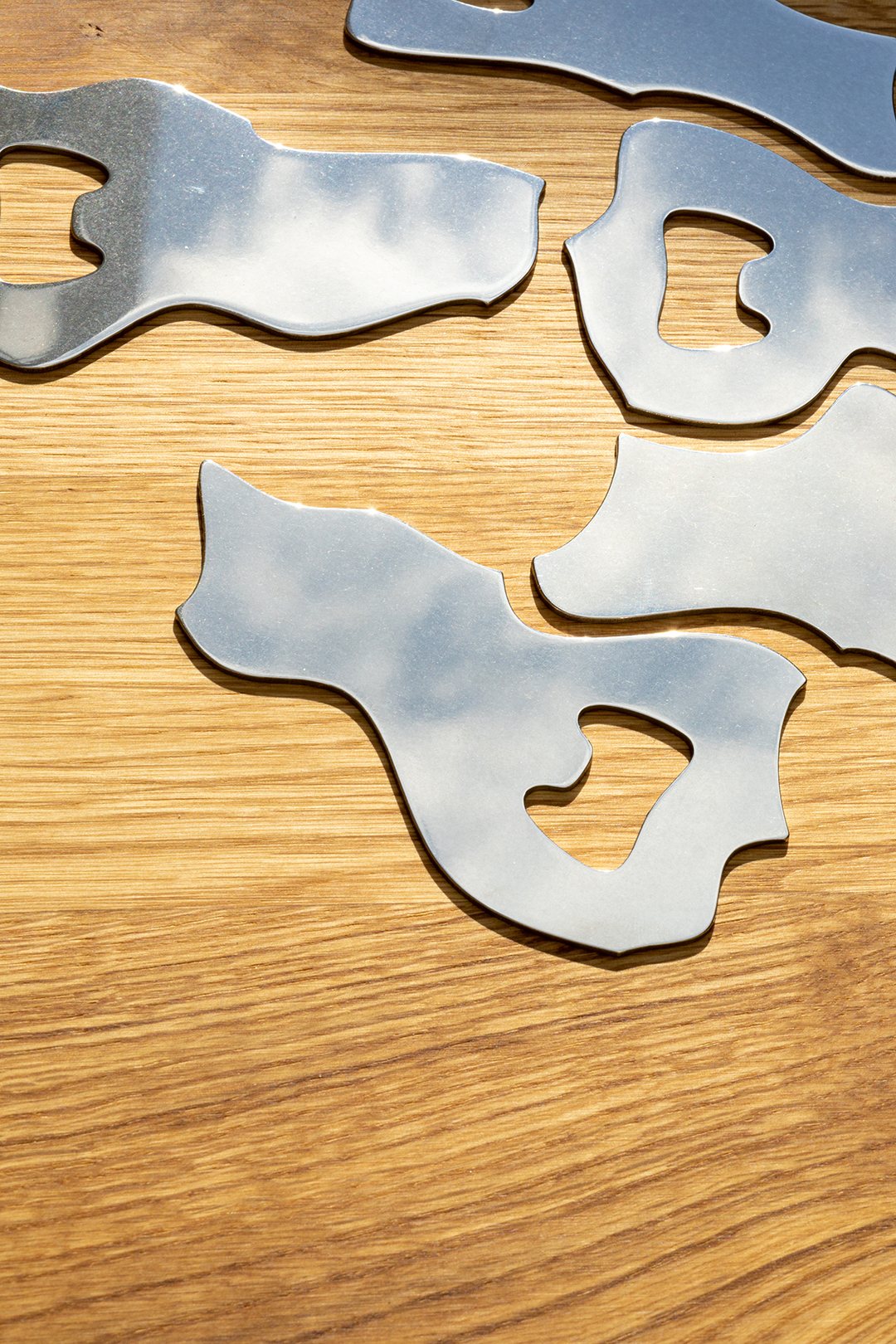 The bottle opener PUDDLE is made of polished & recycled stainless steel. Like a puddle of water, the environment is reflected in it when it is flat on the table. The unusual shapes of the bottle openers are based on low waste production, so less stainless steel sheet is left behind. No PUDDLE looks like the other – you can put them together like a puzzle.
